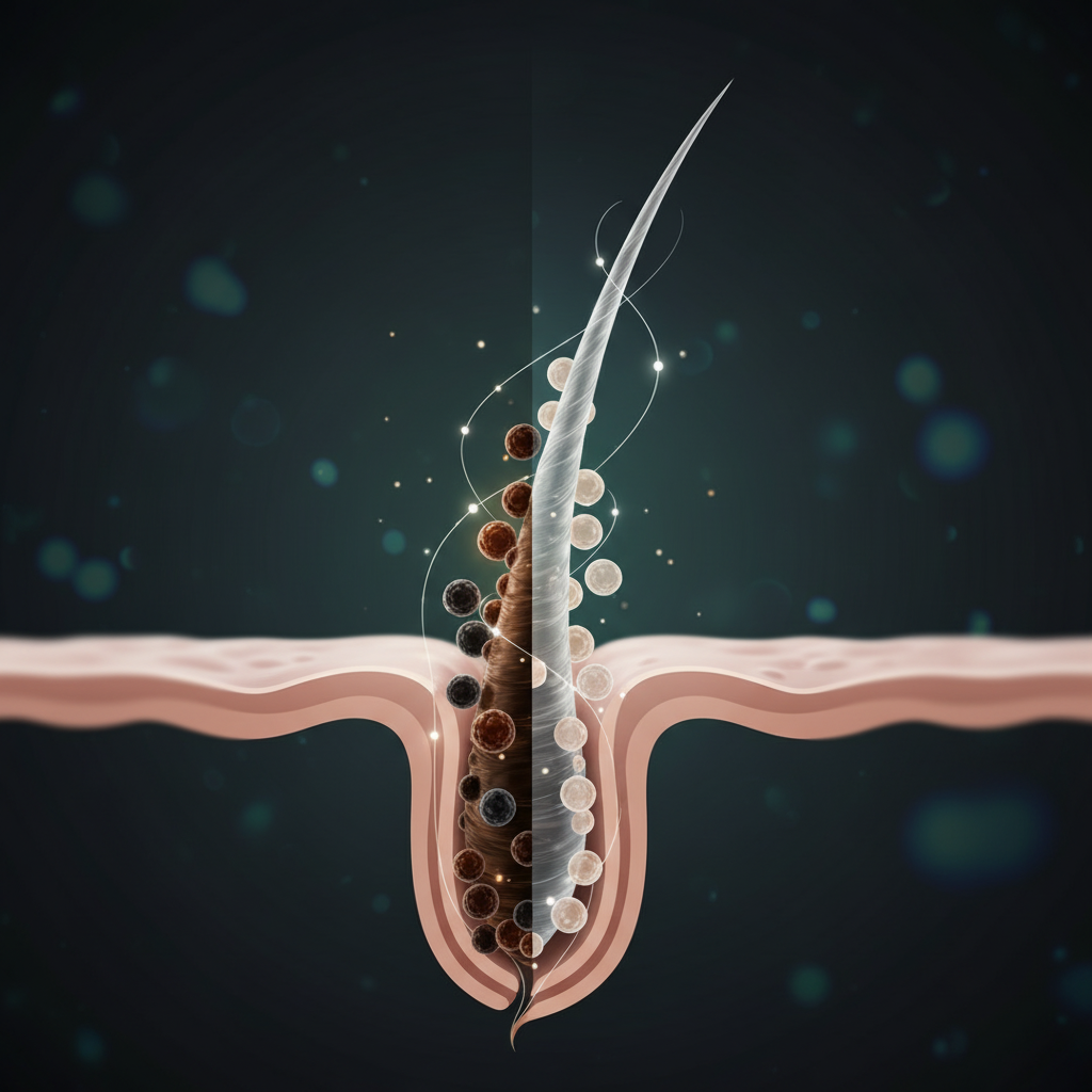 La melanina, el pigmento que da color a tu cabello, disminuye con el tiempo. Este proceso no solo cambia el color, sino que puede hacer que el cabello se vuelva más débil y rebelde, afectando tu apariencia general y la confianza que proyectas.